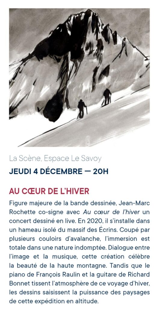 Vous pourrez aussi retrouver les livres de Rochette à la sortie du spectacle notamment son tout dernier livre d'aquarelles, ``Les Ecrins`` sorti le 11 Novembre et aussi disponible à la librairie. Un ouvrage magnifique que vous pourrez faire dédicacer.